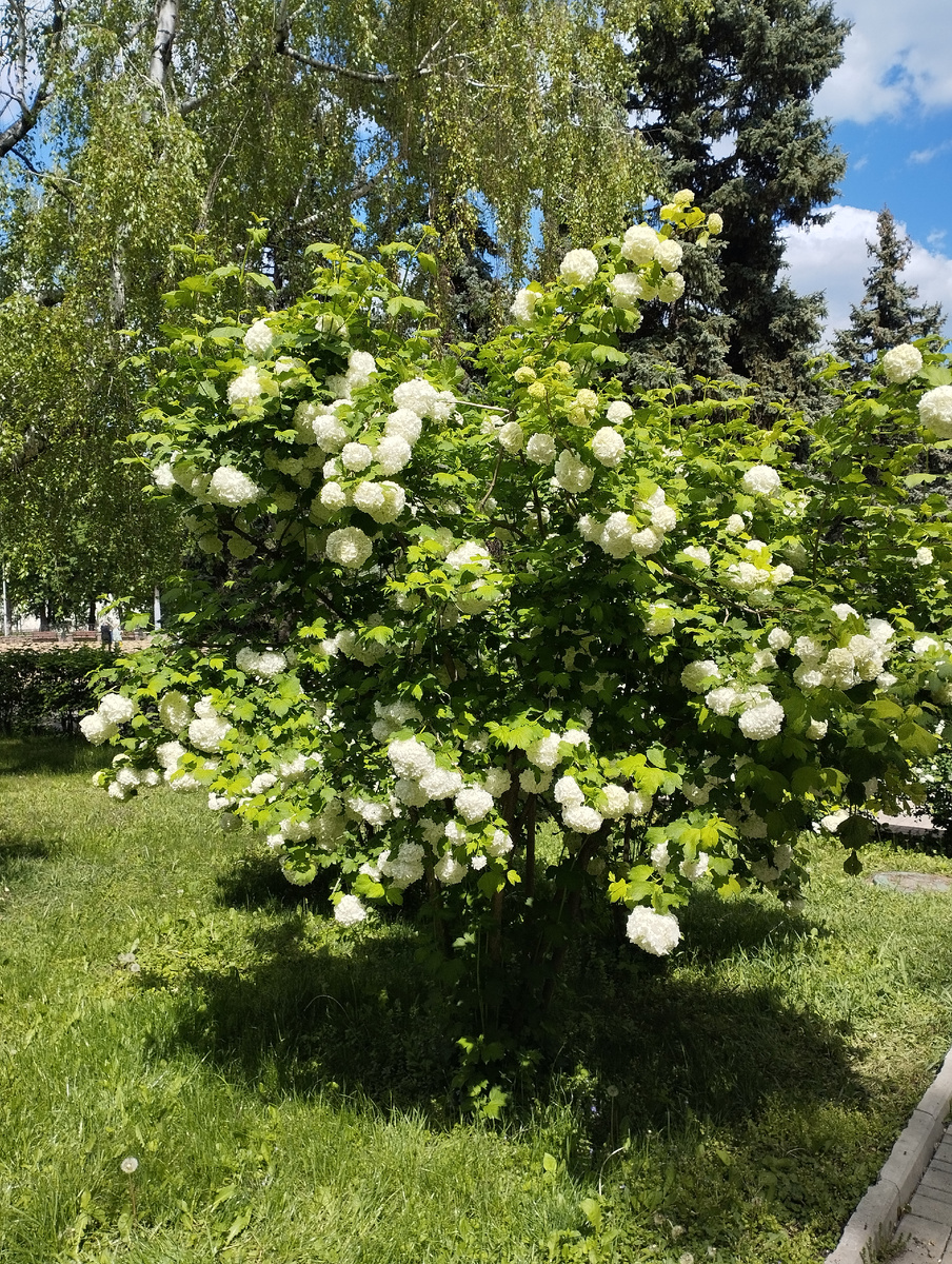 Наверное многие из вас никогда не видели такой прекрасный цветущий куст. О нём расскажу позже. А сейчас о прогулке в праздничный для Донецка минувший воскресный день. Уточню для тех, кто не в теме, о каком празднике идёт речь пока техподдержка ещё не сняла вердикт с моей предыдущей публикации: А теперь в парк. В парк Щербакова, который так любят дончане. К моему огромному сожалению, вход испорчен вот этим верёвочными парком. Справа он ещё не начал работать. А слева уже полный аншлаг. Детворе раздолье. А вот и главный вход в парк с улицы Университетской через мост над первым городским прудом. Его узнаваемая архитектура сразу же говорит о том, что построен во времена сталинского ампира. Немного напоминает наш мост через реку Кальмиус в центре города, к капитальному ремонту которого уже приступили московские шефы: К сожалению, и здесь вид подпортил современный троллей уже неработающий. Но вот здесь глаз радуется. Очень красиво в ясный, но прохладный майский день. Голубое небо, белые обл
