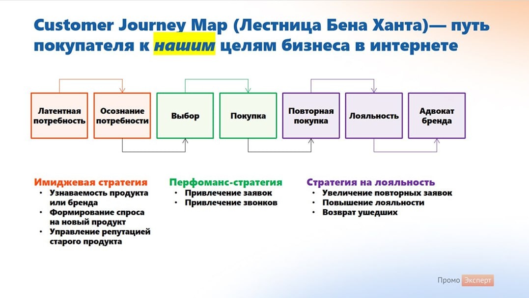 Сегодня поговорим со старшеклассниками. Усложним воронку до 7 этапов и назовём Лестница Бена Ханта. Суть та же, но каждый этап разделён на шаги — ступеньки. На скрине:
