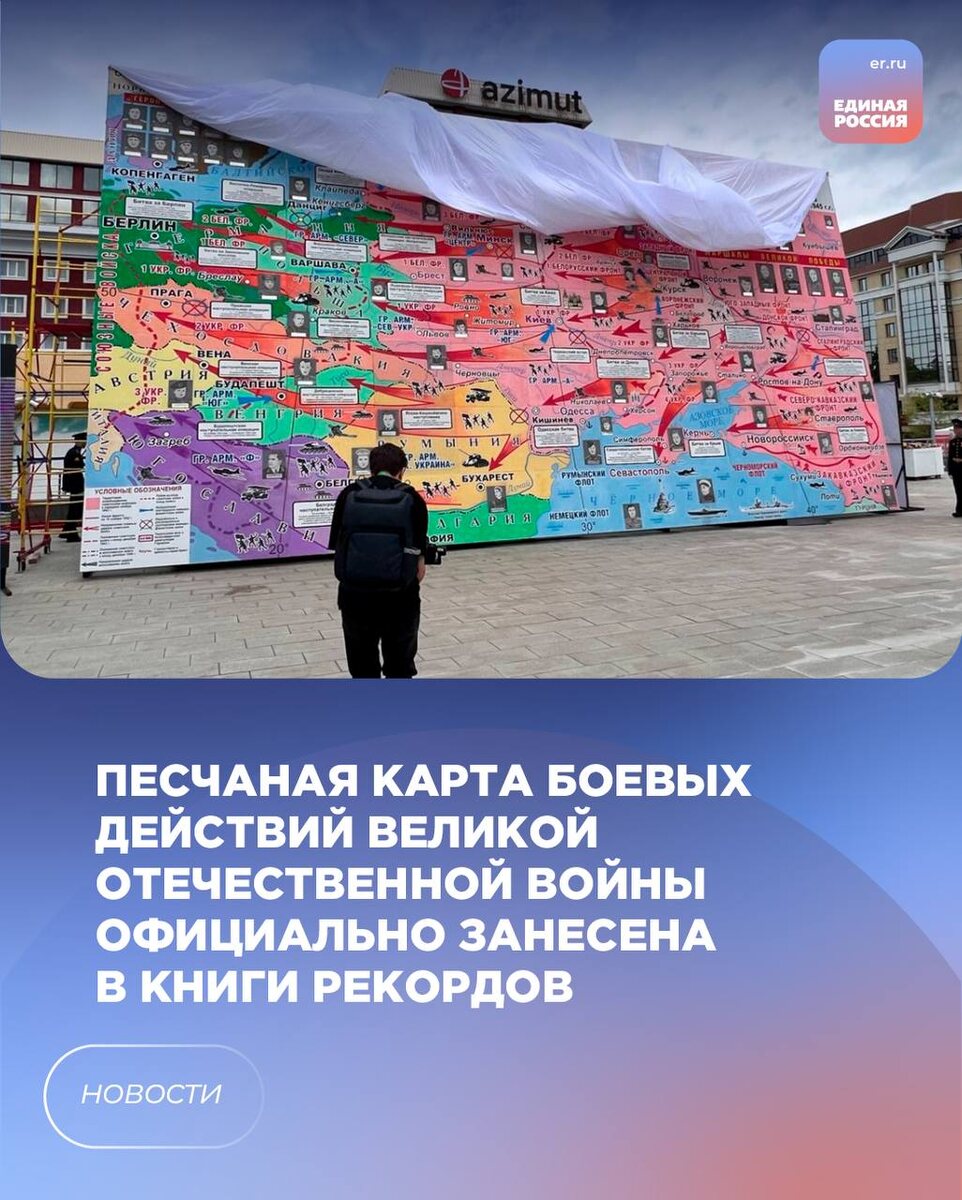 Была представлена уникальная карта из песка, отражающая ход боевых действий ВОВ. Полотно размером 13x7 метров собрано из 77 отдельных фрагментов. Над его созданием на протяжении семи месяцев трудились представители 38 учебных заведений края.