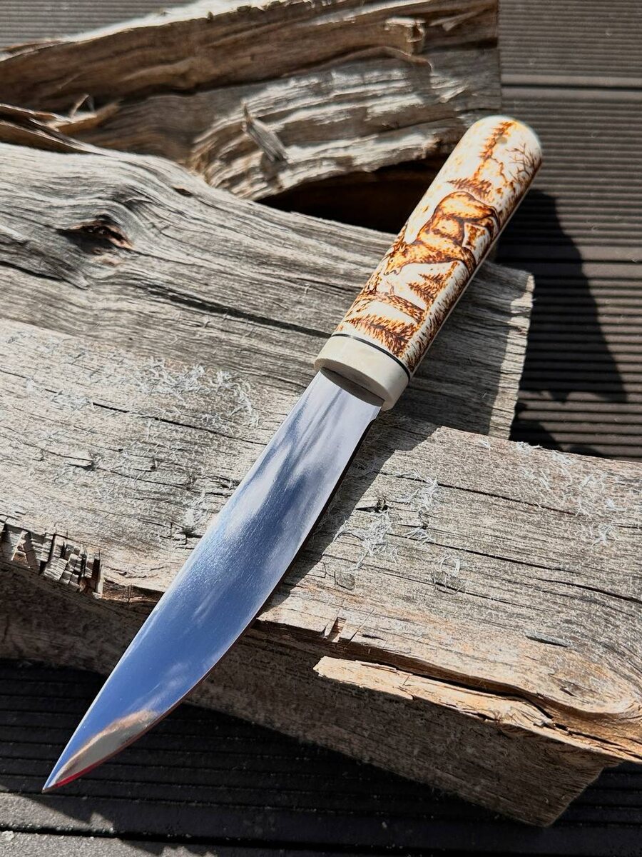 В свободной продаже северный нож. Благодаря своему клинку северный нож легко справится с мороженным мясом, строганием древесины и с другими прочными материалами, в которые обычный нож застрянет. С одной стороны клинок плоский с кованым долом и с другой стороны выпуклый. Выполнен из твердой стали х12мф. Рукоять выполнена из рога лося с пирографией . Твердость клинка (HRC): 61-62 Цена за нож: 25585 рублей, со скидкой: 23.026 рублей. В комплекте идут ножны из натуральной кожи. Можем сделать формованные ножны +8000 рублей. Для заказа писать на @Nazarklinokbot или по тел +79101343831 WhatsApp/Viber
