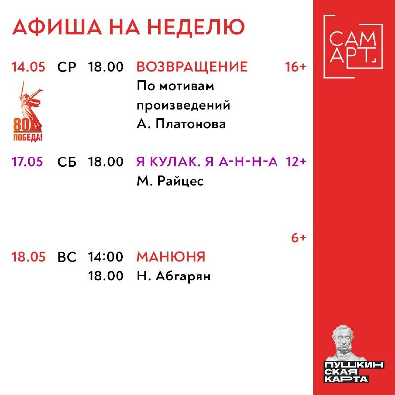 АФИША НА НЕДЕЛЮ: 12 — 18 мая Разбираемся, что смотреть: К юбилею Великой Победы: 🟥 Возвращение | 16+ 14 мая | 18:00 Билетов нет Эскиз-театр: 🟪 «Я КУЛАК. Я А-Н-Н-А» | 12+ 17 мая | 18:00 Купить билеты В театр всей семьёй: 🟥 «Манюня» | 6+ 18 мая | 14:00 и 18:00 Купить билеты