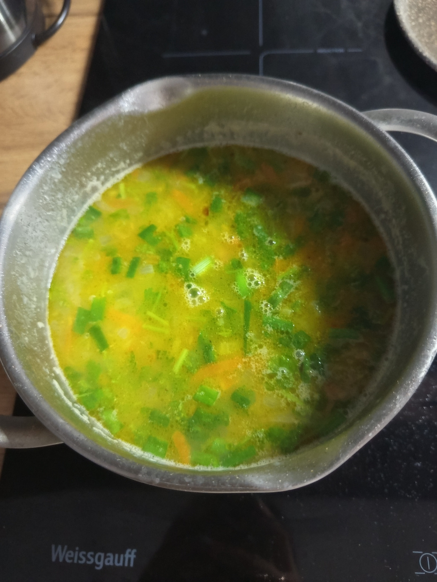 Варим ещё 15 минут. В конце добавляем зелень и специи. Плиту выключаем, суп закрываем крышкой и даём настояться.