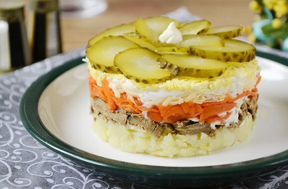 Салат слоеный с печенью трески — это изысканная и популярная закуска, особенно ценимая в российских семьях. Его богатый вкус, приятный аромат и привлекательная структура делают этот салат прекрасным выбором для любого праздничного стола. Представляем классический рецепт. Ингредиенты: - Печень трески консервированная — 1 банка (180–200 г) - Картофель крупный — 3 шт. - Морковь крупная — 2 шт. - Яйца куриные — 4 шт. - Солёные огурцы — 2 шт. - Майонез — по вкусу - Свежая зелень (укроп, петрушка) — для украшения - Соль и перец — по вкусу Порядок приготовления: Этап 1: Подготовка компонентов 1. Картофель: сварите картофель в мундире до полной готовности, затем остудите и очистите. 2. Морковь: сварите морковь до мягкости, затем остудите и очистите. 3. Яйца: сварите вкрутую, очистите и отделите белок от желтка. 4. Огурцы: нарежьте мелкими кубиками. Этап 2: Нарезка и подготовка слоев 1. Натереть на крупной терке: - Картофель - Морковь - Белки яиц 2. Желтки протрите через мелкую терку. Этап 3: С
