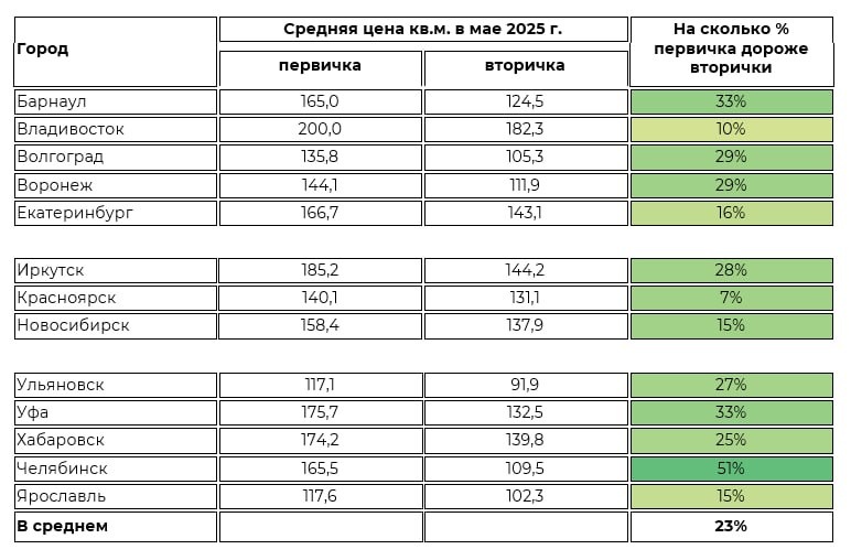 Разница в стоимости квадратного метра на «первичке» и «вторичке» в Иркутске достигла 28% Данные приводит «Циан Аналитика». «Разрыв цен между первичкой и вторичкой продолжает увеличиваться, к настоящему времени он достиг уже 23% – это рекордное значение. Цены в новостройках продолжают расти быстрее, чем в готовом жилье даже после завершения льготной ипотеки: скидок стало больше, но их размер обычно невелик, на рынок выходит меньше новых проектов с дешевым предложением на этапе котлована, растёт себестоимость строительства и затраты на обслуживание подорожавшего проектного финансирования, – комментирует Елена Бобровская, эксперт «Циан Аналитики». – Одновременно на вторичном рынке таких стимулов для роста нет. В большинстве городов цены предложения фактически стагнируют».