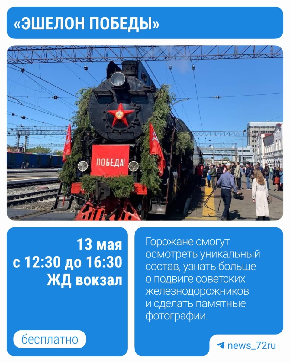 ⭐️В Тюмень едет «Эшелон Победы». В этом году ретро-поезд остановится в трех городах Тюменской области. На железнодорожном вокзале Тюмени поезд остановится 13 мая. Горожане смогут бесплатно осмотреть уникальный состав. Расписание «Эшелона Победы» 📍В Тюмень передвижной музей приедет 13 мая. Он будет стоять на железнодорожном вокзале с 12:30 до 16:30. 📍Затем поезд отправится в Ишим (14 мая, с 10:10 до 12:30). 📍После в Тобольск (16 мая, с 10:00 до 13:00). 📍Завершится маршрут 20 мая в городе Ноябрьске (ЯНАО). Идем? ❤️- да 🔥- каждый год ходим 👎- нет 😎- пойду в первый раз