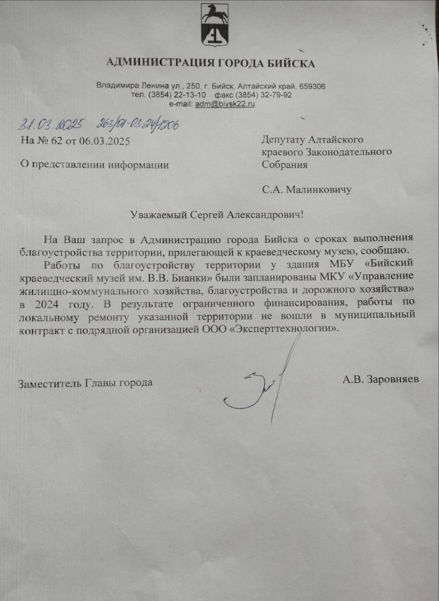 Прекрасно отметили в Алтайском крае 80 лет Великой Победы! Было много интересных, трогательных, глубоко продуманных мероприятий, краевые власти и общественность действительно сделали все, чтобы как можно лучше отметить этот святой день. Надо и во всех других направлениях работы подходить столь же ответственно. Вот, например, ситуация с территорией вокруг краеведческого музея в Бийске. Откровенно говоря, это просто безобразие. После обращения ко мне жителей края я направил соответствующее письмо в мэрию Бийска еще в 2023-м году. Все понимают, что краеведческий музей - лицо города, важнейший объект культурного наследия и туристической инфраструктуры. Работы по благоустройству прилегающей территории были здесь попросту необходимы. Пообветшало дорожное покрытие, рытвины, канавки, явки- все это выглядит совсем уже неприглядно. А привести в порядок совсем не так дорого. В ответ на мое обращение, мэрия Бийска обещала начать необходимые для благоустройства работы в 2024-м году, грозилась с