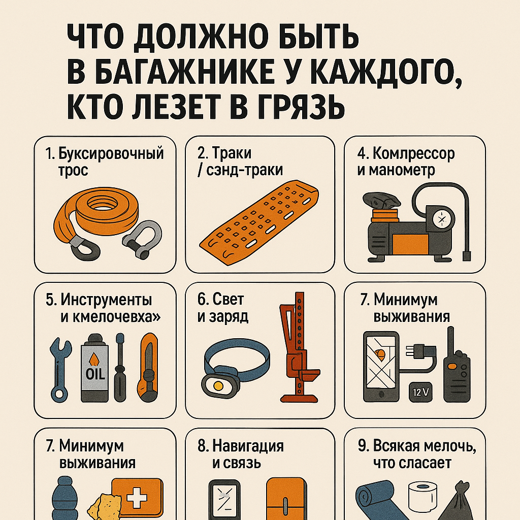 Если ты едешь на оффроуд, а в багажнике только запаска и пылесос — поздравляю, ты уже наполовину клиент трактора. Даже короткая покатушка "на пару часов" в лес может закончиться глубокой ночью с домкратом в руках, лебёдкой на шее и криками "ну тяни уже!" в рацию.