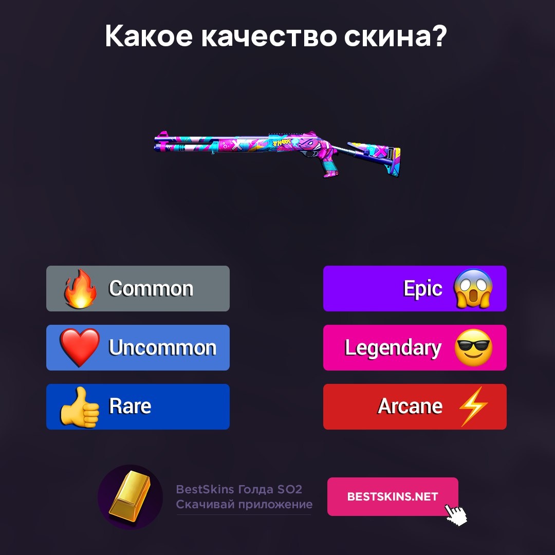 Давайте вместе улучшать знания о скинах! Какое качество? 🤔 Выбирай правильный ответ 🔥 ❤️ 👍 😱 😎 ⚡️