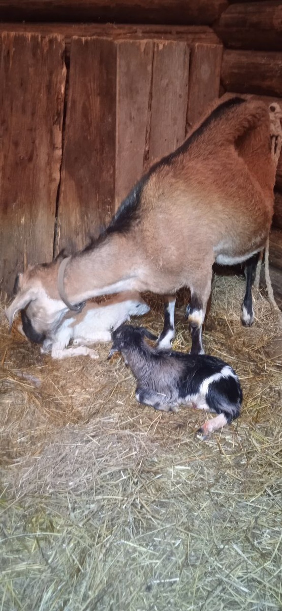 Второй пошёл) Вернее вторая) Двойня крепких козочки и козленка) Хотя коза самая старшая из всех имеющихся у нас в хозяйстве. Поздновато мы нашли козла 🐐 для покрытия коз. Хотя бы на месяц раньше окоты- все бы козлята на выпасе в общем стаде уже бегали бы. На днях ещё окоты от двух коз ждём.