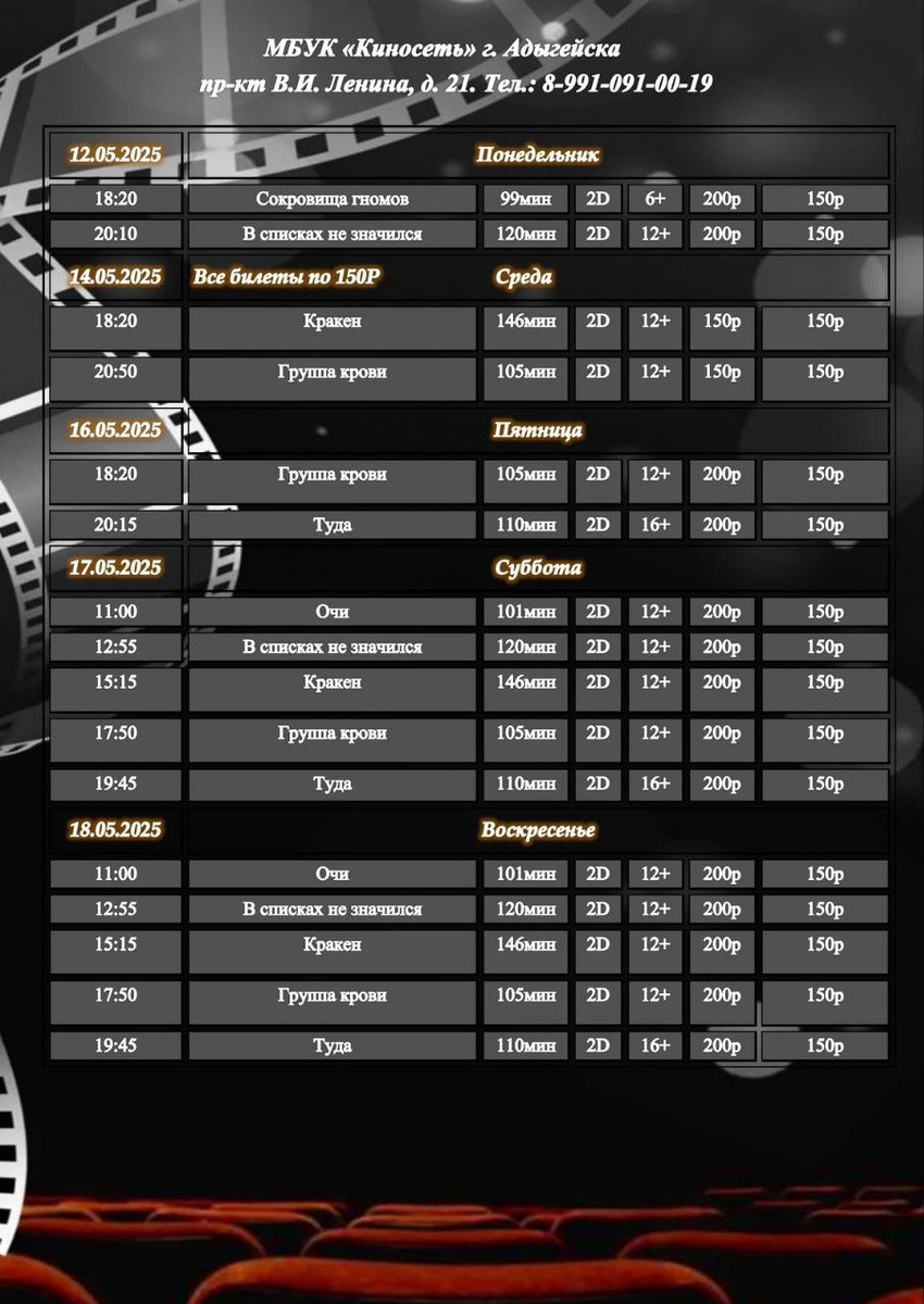 Расписание Кинозала г. Адыгейска с 12.05.2025 по 18.05.2025🎞 Купить билет онлайн можно по ссылке внизу 👇 https://clck.ru/32VTgE ___ Мы в социальных сетях: 🎞https://clck.ru/34TuU5 🎞https://clck.ru/34TuU6 🎞WhatsApp: 8-991-091-00-19 📱8-991-091-00-19