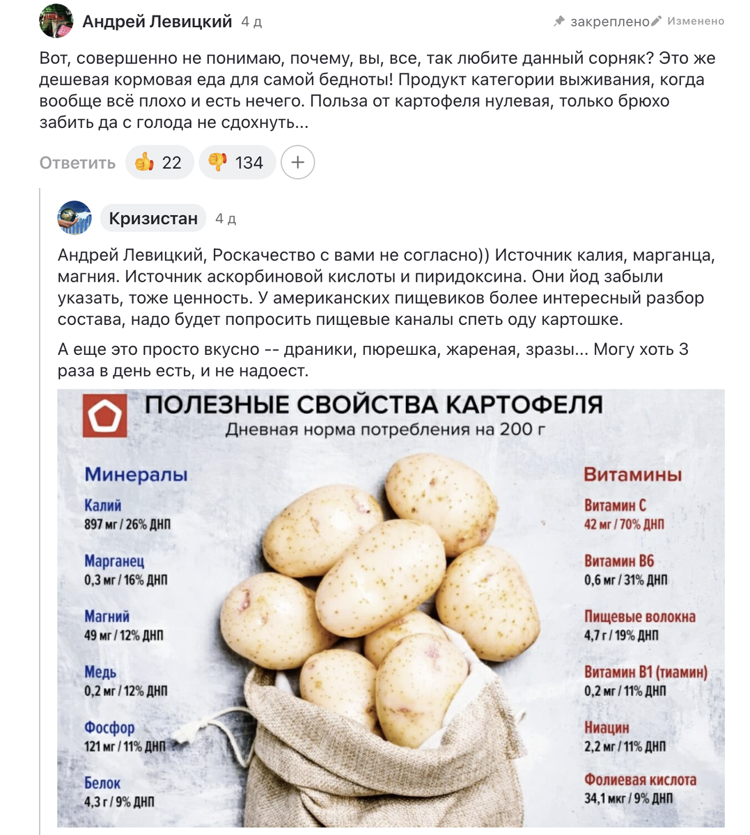 Я его даже закрепил под статьей о способе вернуть доступные цены на любимый и популярный в русской традиционной кухне корнеплод. Оказывается, нравится картошка не всем.