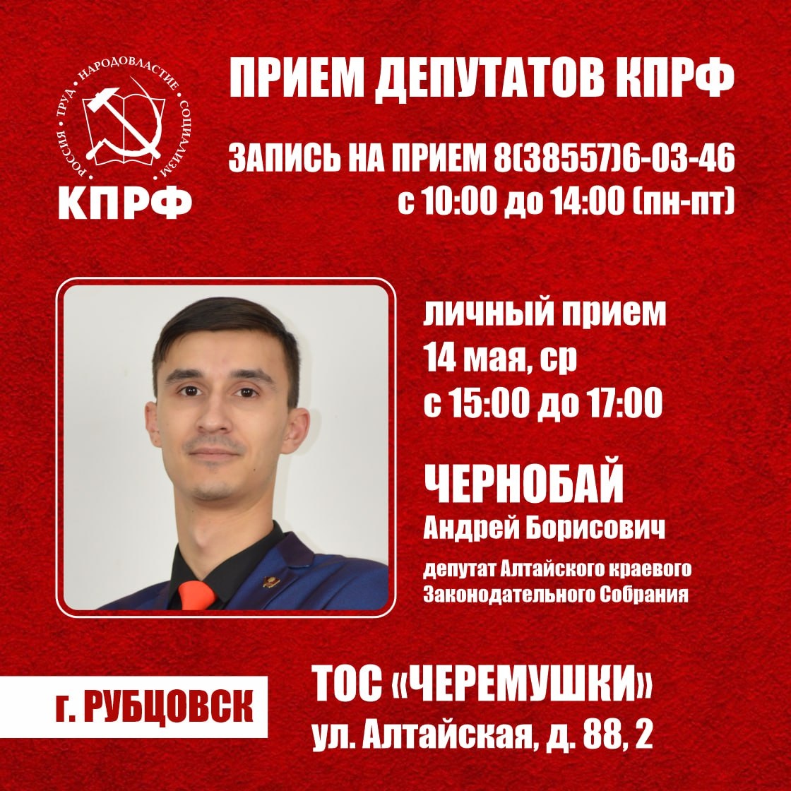 ⚡️Приемные дни депутатов Алтайского краевого Законодательного Собрания по адресу: г. Рубцовск, ул. Алтайская, д. 88, 2 тел. 8(38557)6-03-46 📌14 мая, ср, с 15:00 до 17:00 ЧЕРНОБАЙ Андрей Борисович депутат Алтайского краевого Законодательного Собрания