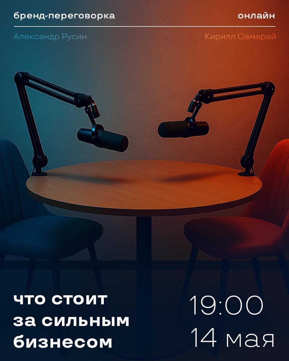 14 мая в 19:00 наш СЕО Александр Русин и бренд-стратег Кирилл Самарай встретятся в бренд-переговорке, чтобы обсудить: «Что стоит за сильным бизнесом: влияние стратегии на бренд»