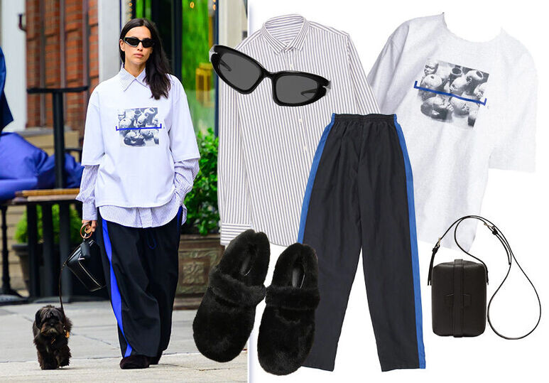 На Ирине: широкие спортивные брюки с синими лампасами, свободная белая футболка с принтом, а под ней — полосатая рубашка в мужском стиле. Образ дополняют крупная черная сумка, пушистые тапки и солнцезащитные очки в плотной оправе. Волосы свободно распущены, макияжа почти нет.