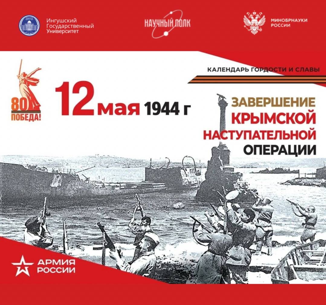 #НаучныйПолк #НаучныйПолк2025 День победного завершения советскими войсками Крымской наступательной операции. ▫️ 12 мая 1944 года — важная дата в истории Великой Отечественной войны, ознаменовавшая завершение Крымской наступательной операции, проведенной советскими войсками. Эта операция стала одним из ключевых этапов освобождения Крыма от немецко-фашистских захватчиков и сыграла значительную роль в общих успехах Советского Союза на фронте. ➡️С началом операции, которая стартовала 8 апреля 1944 года, советские войска стремительно продвигались к освобождению полуострова. Основные силы Красной Армии были сосредоточены в составе 4-го Украинского фронта под командованием генерала Ивана Коневa. ☑️ В результате успешных действий советских войск, к 12 мая 1944 года Крым был полностью освобожден от оккупантов. Это событие стало не только военной победой, но и символом мужества и стойкости советского народа в борьбе с фашизмом. 🔵 Подписаться на ИнгГУ