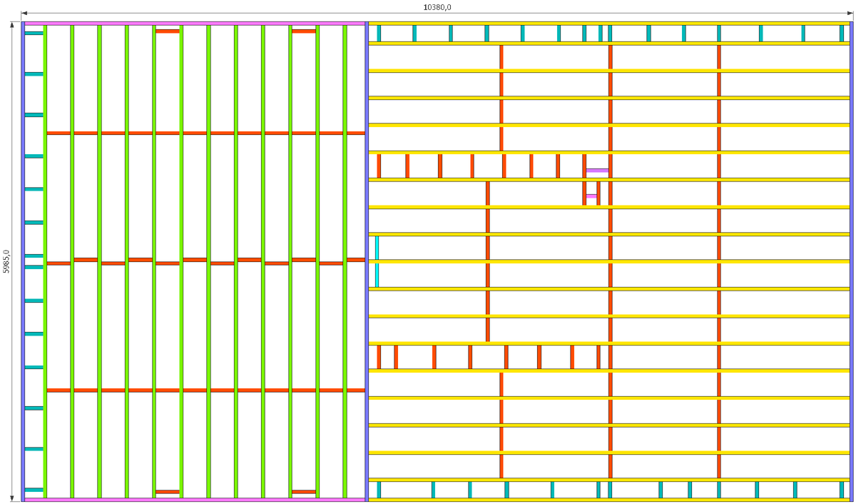 В каркасе учтены расположения стен и перегородок, а также обшивка пола фанерой - перемычки расположены по размерам листов 1525х1525 с учётом зазоров в 4 мм: