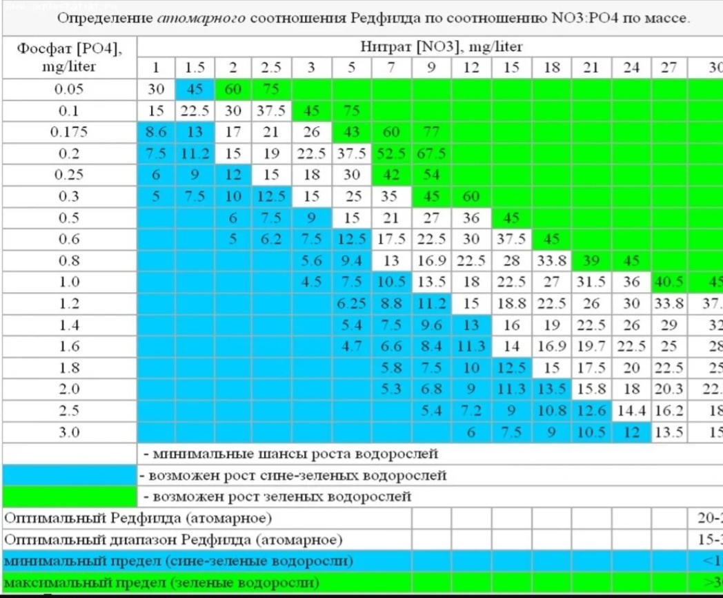 ## Пропорции Редфилда в пресноводном аквариуме: контроль фосфатов и нитратов ### Что такое пропорции Редфилда **Пропорции Редфилда** представляют собой соотношение основных биогенных элементов, необходимых для роста живых организмов в водной среде. В пресноводных аквариумах особое значение имеет соотношение **нитратов** (NO₃⁻) и **фосфатов** (PO₄³⁻), которые являются ключевыми питательными веществами для аквариумных растений. ### Базовое соотношение элементов В пресноводных системах используется упрощенная пропорция: * **N:P = 16:1** Это означает, что на каждые 16 частей нитратов должно приходиться 1 часть фосфатов для оптимального роста растений. ### Оптимальные показатели для пресноводного аквариума **Рекомендуемые уровни:** * Нитраты: 5-20 мг/л * Фосфаты: 0.1-0.5 мг/л При таких показателях: * Растения растут здоровыми и крепкими * Снижается риск появления нежелательных водорослей * Поддерживается биологический баланс ### Практическое применение **Контроль параметров:** *