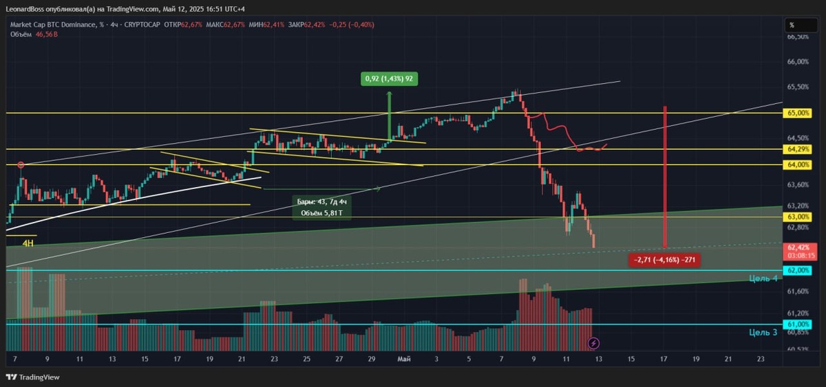 В ответ на пост #BTC.D 🔽Доминация🔽 ⚠️Тут всё четко, как по часам, даже больше. Кто прислушался и успел, тот с профитом. График значения ожидаемо полетел вниз и пришел в локальную зону поддержки, тот самый глобальный буфер, который выступал сильнейшим сопротивлением при глобальном росте! На фоне отскока #DXY будьте аккуратны, вероятен коррекционный отсткок от зоны уровня 62%!! ⚠️Глобальный (недельный 2й график) выглядит также позитивно и очень давненько не рисовал нам такие картинки. Прошлая недельная свеча мощнейшая для старта снижения. При этом, график всё еще находится над поддержкой и её диапазон достаточно высок, поскольку под буфером поддержки находится исторически сильный блок поддержки с нижней границей уровня 58%. Если выйдем ниже буфера, это будет 50% успеха. Чтобы увидеть настоящие ракеты на альтах, необходимо уехать хотя бы ниже 60% и там закрепиться!! P.s. итак, основатель рынка крипты (BTC) показывает силу! Стартовое движение на укрепление рынка альтов получили. Общий