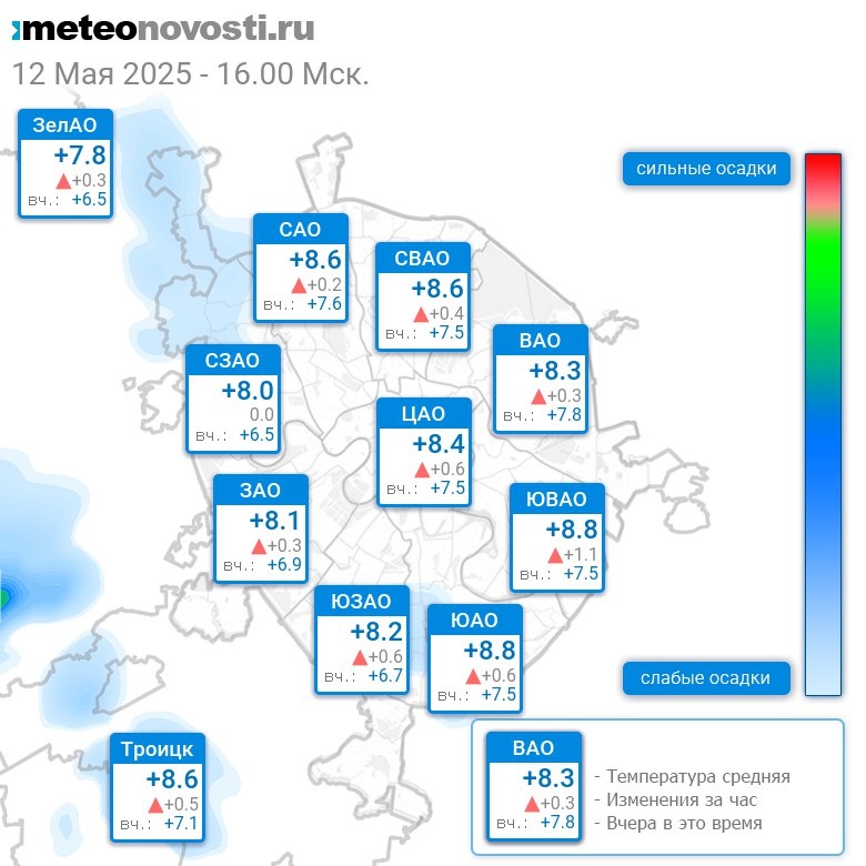 В 16:00 в Москве было от +6.9°C до +10.2°C, средняя температура +8.5°C #погода #Москва #весна #температура #12мая #понедельник