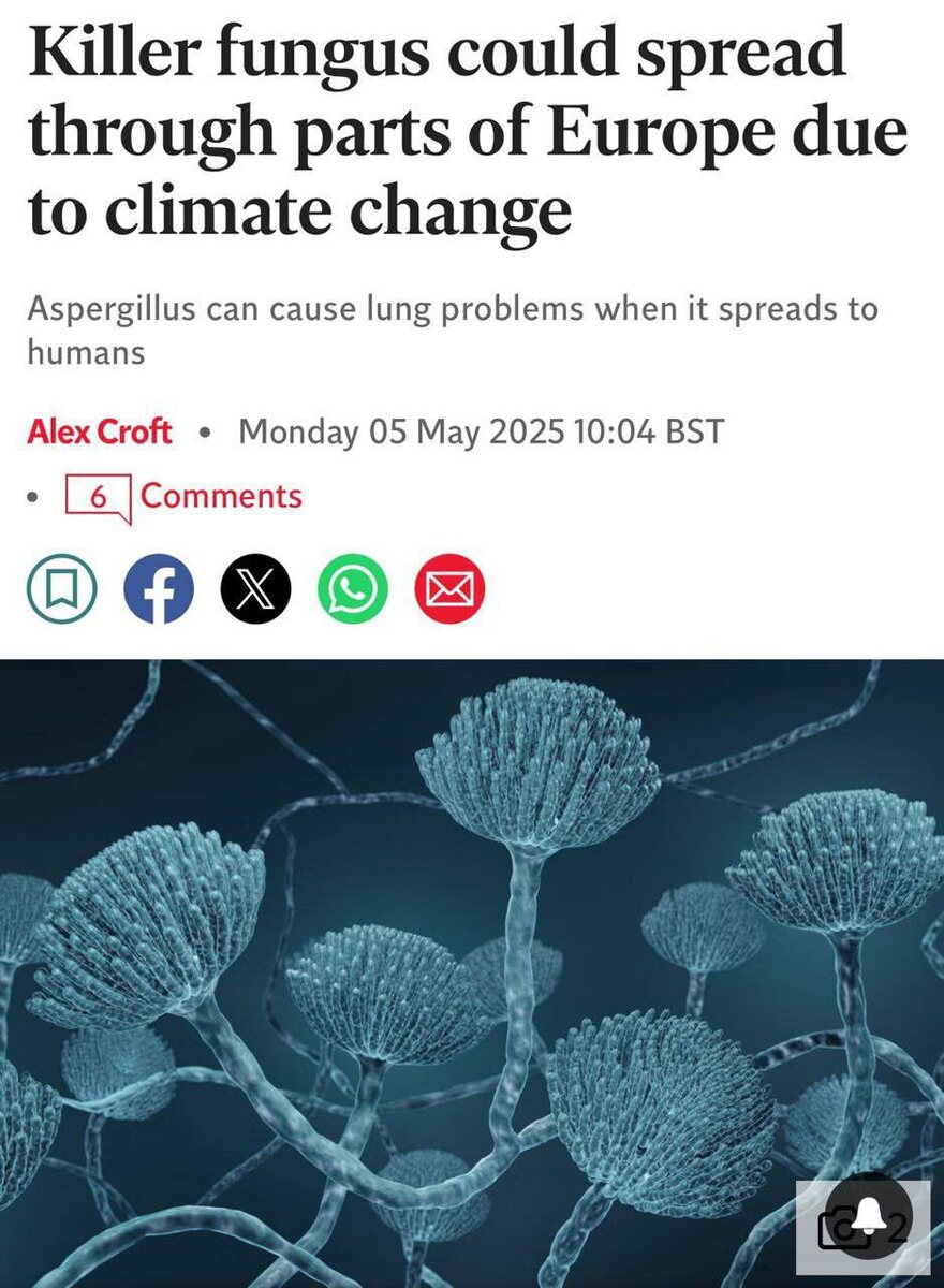 СМЕРТЕЛЬНЫЙ грибок может УНИЧТОЖИТЬ всю Европу и добраться до России — ученые в тревоге. Грибок Aspergillus начал стремительно развиваться из-за резкого изменения климата. Его споры поражают легкие и забивают бронхи, что делает дыхание невозможным. Особенно он опасен для астматиков, людей с ослабленным иммунитетом и хроническими заболеваниями. По словам ученых, грибок может полностью уничтожить Европу, затронуть часть России и даже часть Китая. NeuroFlux #ИИ #Технологии #наука #нейросети #ИнтернетСвобода #ИскусственныйИнтеллект