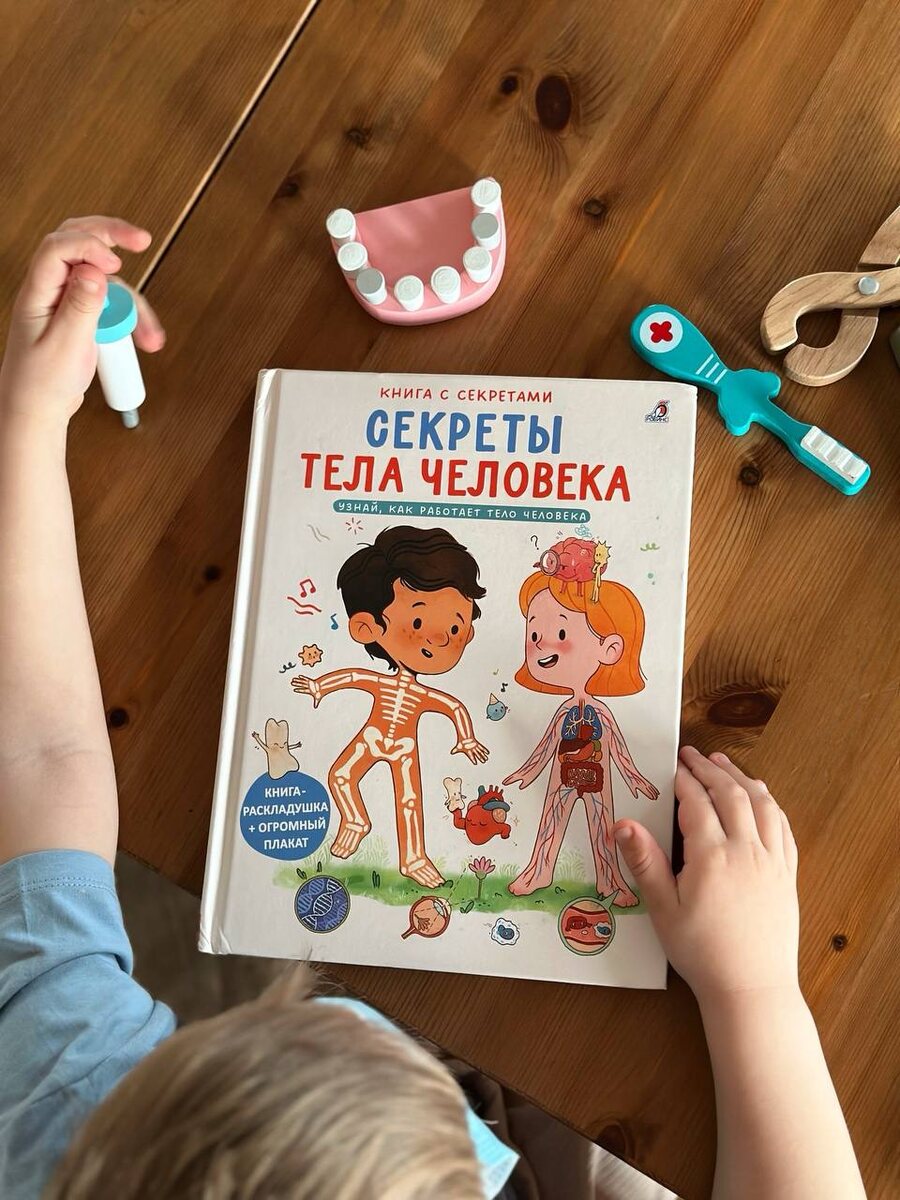 Книга "Секреты тела человека" 🟠🟤⚪️🔵🟠🟤⚪️🔵🟠 — анатомический атлас для детей, который приятно удивил меня, как врача и маму. Спасибо издательству Робинс 🐦, книга - топ 🔥 Мы с сыном начали её изучать, и я вижу живой интерес с его стороны — для меня это бесценно. Книга очень напоминает атлас Синельникова, но в детском, адаптированном формате (медики поймут 🙈). В книге 40 страниц, включая 6 крупных разворотов, каждый из которых посвящён определённой теме. Всё подаётся через визуально яркие и милые иллюстрации, которые не пугают, а наоборот — увлекают ребёнка. Отдельный бонус — большой постер, который можно повесить на стену и использовать как шпаргалку или элемент игрового обучения. Для меня важно, что в книге не рассматривается репродуктивная система. Сейчас я не считаю нужным углубленно изучать с сыном половое воспитание, и мне удобно, что эта тема здесь опущена. Конечно, для кого-то это может быть минусом. Книга отлично подойдёт для детей 4–8 лет и будет особенно интересна те