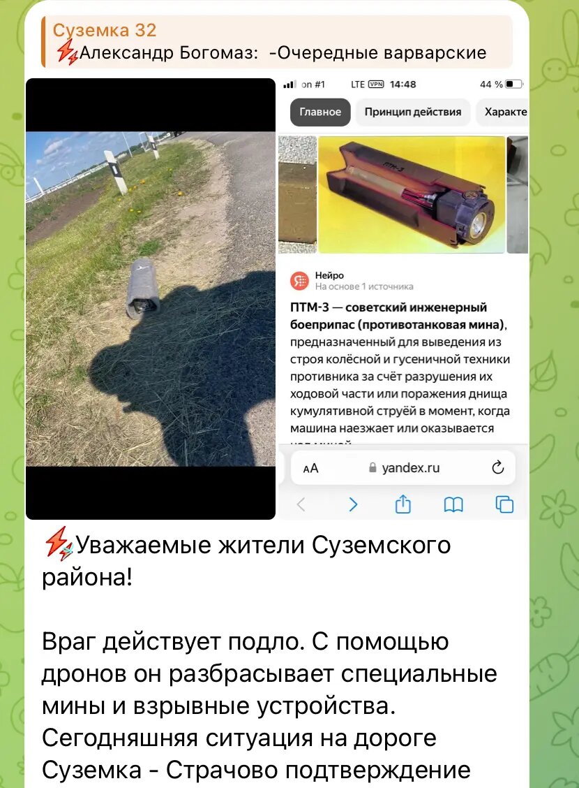 Жителей Брянской области предупредили о смертельных находках на дорогах. Соответствующее обращение появилось в телеграм-канале «Суземка 32». Сегодня в Суземском районе произошел трагический случай, о нем сообщил губернатор. На дороге Суземка-Страчово во время движения гражданского автомобиля сдетонировало дистанционное взрывное устройство. Осколочные ранения различной степени тяжести получили два мирных жителя − мужчина и женщина. В телеграм-канале уточняется, что украинские формирования с помощью дронов разбрасывают специальные мины и взрывные устройства. Предварительно известно, что жители Брянской области могли пострадать в результате подрыва именно такого устройства. Скриншот телеграм-канала «Суземка 32» Мина лежала на обочине, была активирована в нужный момент взорвалась. Всех граждан приграничья попросили быть внимательными, обращать внимание на подозрительные предметы. Также ранее губернатор заявил, что враг беспощаден и подло атакует. Александр Богомаз призвал всех к осторожнос