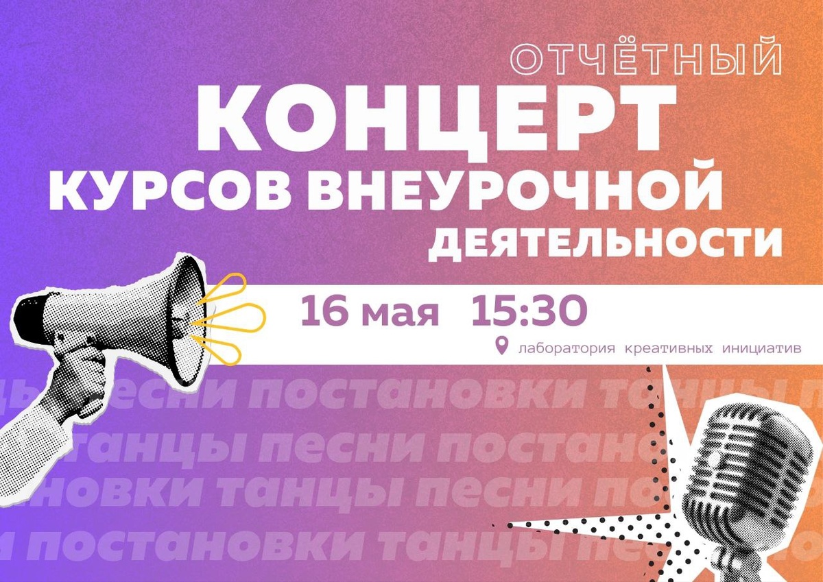 ОТЧЁТНЫЙ КОНЦЕРТ 🌟 Дорогие учителя, ученики и родители Школы экономики и права! Приглашаем почувствовать атмосферу творчества, увидеть плоды труда шэповцев и зарядиться позитивом на весь день на отчётном концерте курсов внеурочной деятельности! Ребята репетировали, творили, оттачивали мастерство. И теперь наши талантливые шэповцы готовы показать вам каких высот они достигли за полгода упорной работы! Ждём всех, чтобы вместе: ✅ Подвести итоги полугодия в ритме музыки, танца и креатива, ✅ Увидеть, как труд превращается в искусство, ✅ Поддержать наших звёздочек бурными аплодисментами! В программе: 📎 музыкальные номера; 📎 танцевальные выступления; 📎 сценки и постановки; 📎и многое другое. 📅 Когда? 16 мая, 15:30. 📍 Где? Лаборатория креативных инициатив С нетерпением ждём вас на отчётном концерте! 😉 #ШЭП #ШколаЭкономикииПрава #события_ШЭП #Анонс_ШЭП
