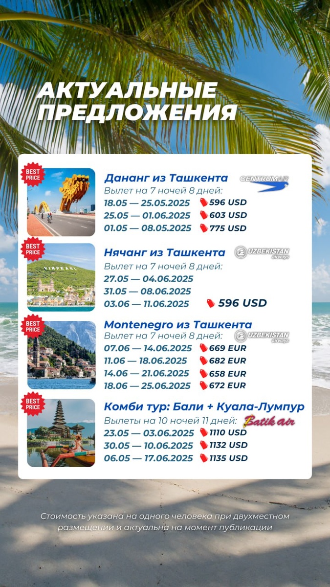 ❤️☀️ С бодрым понедельником, дорогие друзья! 🥰 Предлагаем начать день с улыбки и с выгодных предложений по всем направлениям 📌Стоимость указана на одного человека при двухместном размещении и актуальна на момент публикации 🌐Наш сайт для бронирования ⚡️ Умный бот для подбора туров Наши контакты : https://taplink.cc/gidtraveluz +998 93-322-75-77 +998 77-709-33-66