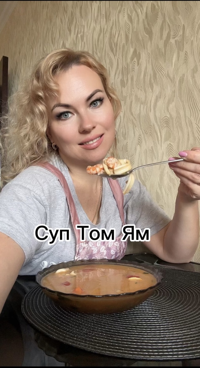 Время приготовления -20 минут. Список продуктов и расчет стоимости: Фото продуктов! Из этого состава продуктов обычно варю 3-4 литра. -В кипящую воду или бульон( можно куриный, рыбный) добавляем пасту том ям.( Пасту беру разную, какая бывает по акциям, грамм 200 нужно, граммовка разная у всех.) -Закидываем резаные шампиньоны, варим 5 мин. -Добавляю соль по вкусу, соевый соус 100-150 мл -Кокосовое молоко или пачку сливок 20%( сын добавляет и то и то, я что то одно! ) -Друг за другом закидываем морепродукты( чаще всего беру 300 гр креветок и 300 гр кальмаров, чищу, режу) , помидоры, выжимаем сок половины лайма или лимона, кинза в конце. Лайфхак: Морепродукты не варить дольше 2 ух мин, ( будут жесткими) Лайм можно менять на лимон, Бульон можно менять на воду, Помидоры чери иногда меняю на сливку-важно чтоб были не кислые, Редко добавляю имбирь, не очень нравится он в супе. В пасте оранжевой уже все есть в составе и она острее, сын ее больше любит, чем sen soy. Приятного аппетит