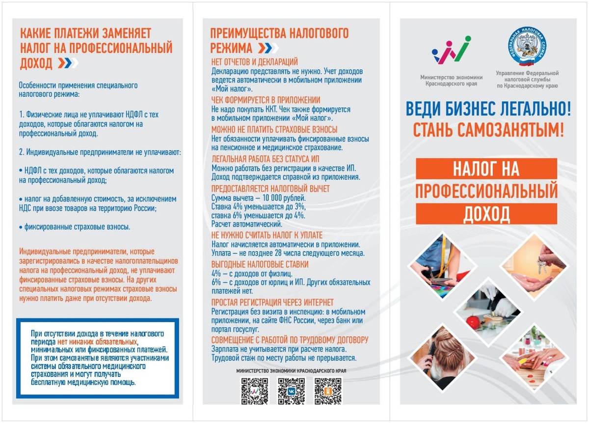 Налог на профессиональный доход (НПД) или налог для самозанятых – это специальный налоговый режим для физических лиц и индивидуальных предпринимателей (ИП), не имеющих работников. Переход на специальный налоговый режим осуществляется добровольно. Физические лица и ИП, которые перешли на специальный налоговый режим, платят с доходов от самостоятельной деятельности налог по льготной ставке – 4% от доходов, полученных от физических лиц и 6% от доходов, полученных от организаций и ИП. Самозанятых привлекает возможность работать и зарабатывать легально, а самое главное данный режим налогообложения полностью цифровизован, что делает его максимально удобным. Все взаимодействия с налоговыми органами, банком, клиентами осуществляется через мобильное приложение «Мой налог», исключая необходимость личного посещения учреждений. Продолжение по ссылке