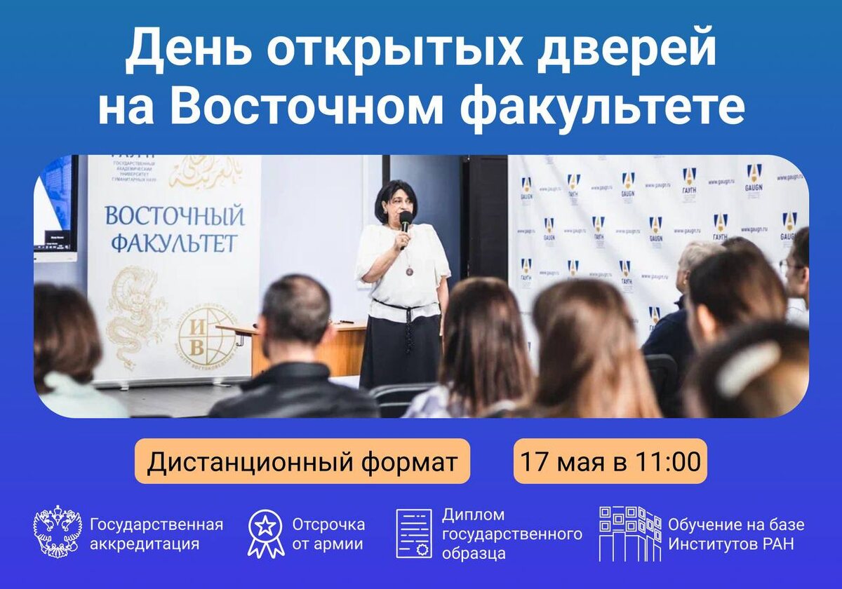 🏮 Восточный факультет приглашает на День открытых дверей 🏮 🎓 17 мая состоится День открытых дверей программы бакалавриата Восточного факультета ГАУГН по профилю «История стран Азии и Африки» в дистанционном формате. На мероприятии абитуриенты узнают: 📌 Как студенты изучают восточный язык за 4 года бакалавриата; 📌 Как проходит обучение: объём, нагрузка; 📌 Как устроены занятия с носителем; 📆 Дата и время: 17 мая в 11:00. 💻 Формат: дистанционное подключение. Зарегистрироваться на День открытых дверей можно по ссылке. Ждём вас в ГАУГН! #ГАУГН #Восточныйфакультет #День_открытых_дверей #Абитуриенты2025 #простРАНство_ГАУГН #gaugn_priem
