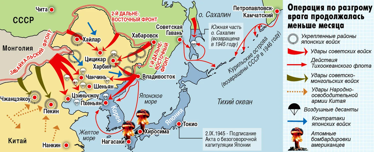 В российских школах традиционно уделяют большое внимание окончанию Великой Отечественной войны (9 мая 1945 года), однако гораздо реже говорят о дате завершения Второй мировой войны (2 сентября 1945 года). Интересно, что если спросить современных подростков, когда закончилась Вторая мировая война, многие ответят — 2 сентября. В то же время старшее поколение чаще вспоминает только 9 мая. 9 мая (в Европе — 8 мая) 1945 года нацистская Германия капитулировала, и в СССР объявили о Победе. Однако война на этом не закончилась — в Азии продолжались боевые действия. Даже атомные бомбардировки Хиросимы и Нагасаки (6 и 9 августа 1945 года) не сломили Японию окончательно: её армия, насчитывавшая более миллиона солдат, всё ещё удерживала позиции в Китае и Корее. 8 августа 1945 года СССР, выполняя союзнические обязательства, объявил войну Японии. Советские войска начали масштабное наступление в Маньчжурии, освободили север Китая, а также полностью заняли Южный Сахалин и Курильские острова. Однако Акт