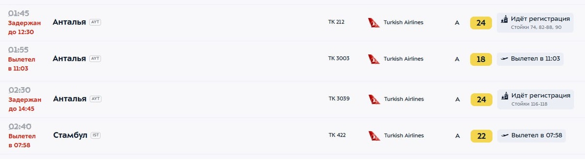В ответ на пост Пассажиры Turkish Airlines все еще ощущают последствия массовой отмены рейсов, которая случилась на фоне закрытия московских аэропортов. Задержки по-прежнему существенные – как и в предыдущие дни. Из Пулково в Анталью и Стамбул самолеты опаздывают в среднем на 6 часов, из Внуково время ожидания доходит до 11–12 часов. Об актуальной ситуации написали на ТурДоме. @tourdom