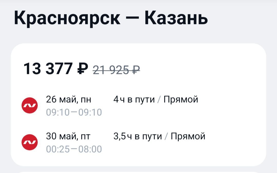 Из Красноярска в Казань в конце мая за 13300₽ ↔️ без багажа.