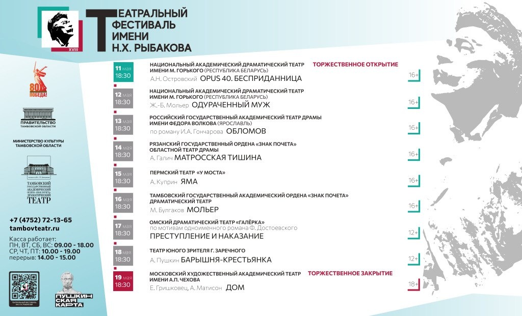 В Тамбовской области стартовал театральный фестиваль имени Рыбакова (16+) В Тамбовской области торжественно открылся XVIII межрегиональный театральный фестиваль имени Н.Х. Рыбакова, в этом году посвященный 80-летию Победы в Великой Отечественной войне. Открыл фестиваль Национальный академический драматический театр имени М. Горького (Республика Беларусь). Вчера, 11 мая, он представил спектакль «OPUS 40. Бесприданница» по Александру Островскому», сегодня ожидается ещё один — «Одураченный муж» по Ж.-Б. Мольеру. Фестиваль продлится до 19 мая. В конкурсной программе примут участие ведущие театры России, в том числе Российский государственный академический театр драмы имени Федора Волкова, Рязанский государственный ордена «Знак Почета» областной театр драмы, Пермский театр «У Моста», Тамбовский государственный академический ордена «Знак Почета» драматический театр, Омский драматический театр «Галёрка» и Театр юного зрителя города Заречного. Возглавит жюри заслуженный артист РФ Михаил Серг