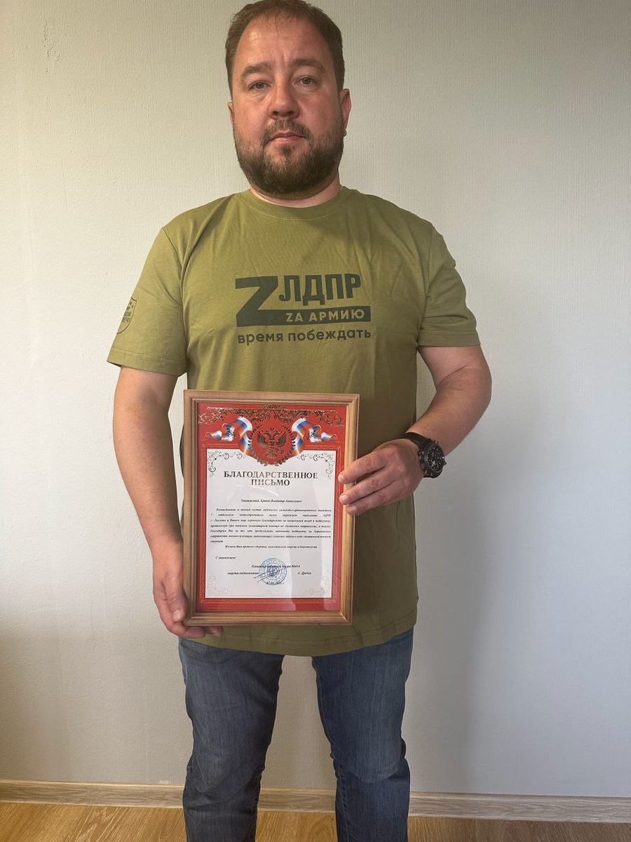 За помощь фронту Лысковское отделение ЛДПР наградили благодарностью Более тридцати девяти поездок с гуманитарной миссией, свыше 95 тонн доставленного груза, взаимодействие с общественными организациями и волонтёрами – работа по поддержке наших военнослужащих ведётся Нижегородским отделением ЛДПР непрерывно. Так, наши партийцы из Лысково на протяжении долгого времени оказывают посильную помощь бойцам СВО. Недавно на передовую были отправлены предметы быта и автомобиль. Координатору Лысковского отделения ЛДПР Владимиру Ершову передали благодарственное письмо с занесением в книгу полка. Напомним, ранее депутаты и координаторы ЛДПР приняли участие в сборе и доставке гуманитарной помощи в зону СВО.