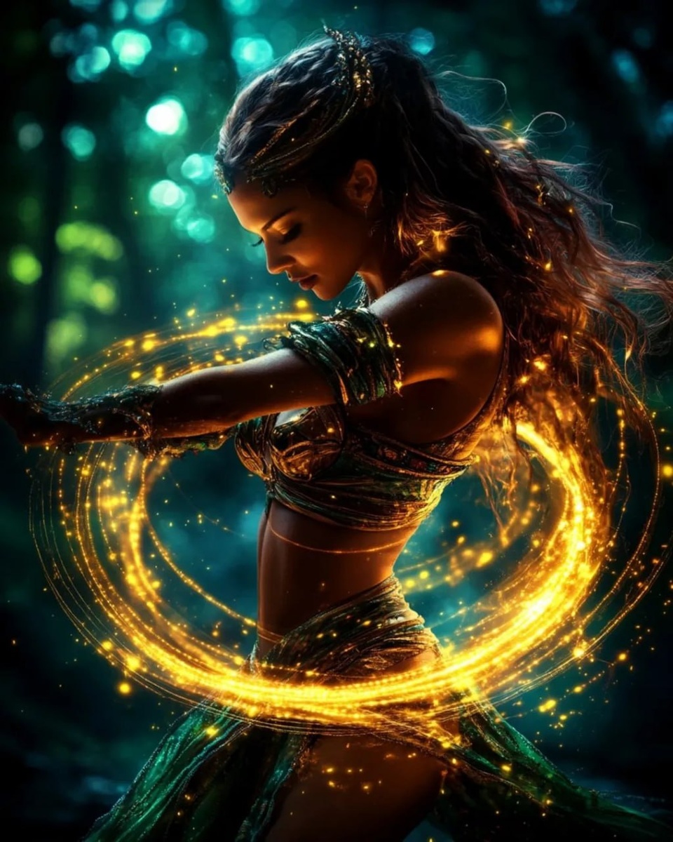 Её золотая аура сверкает, как звезды на ночном небе, наполняя пространство светом и энергией. Каждое её движение — это не просто танец, а гармония силы и красоты. Она кружится в ритме леса, словно сама природа подстраивается под её шаги. Листья шуршат под её ногами, а ветер играет с её волосами, создавая симфонию звуков, которая завораживает и уносит в другой мир.