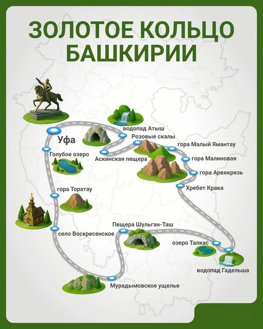 «Золотое кольцо Башкирии» включает в себя посещение горы Торатау В республике представлен проект «Золотое кольцо Башкирии», направленный, прежде всего, на привлечение жителей других регионов страны, а также иностранных туристов. В целом, увлекательная поездка с посещением уникальных достопримечательностей займёт не более трёх дней, а длина маршрута измеряется почти тысячей километров. Путешествие стартует из столицы Башкортостана. Из Уфы путь лежит на Голубое озеро, затем – на гору Торатау и в село Воскресенское. Оттуда завернёт в Мурадымовское ущелье и всемирно знаменитую Капову пещеру. Далее маршрут пролегает на озеро Талкас, водопад Гадельша и к хребету Крака. После будут горы Арвякрязь и Малиновая, посещение реки Инзер, горы Малый Ямантау, Розовых скал и Аскинской пещеры. Конечной точкой «Золотого кольца Башкирии» значится водопад Атыш, что расположен в Архангельском районе. Планируется, что вдоль маршрута появится туристическая инфраструктура высокого уровня. Кроме хороших дорог,