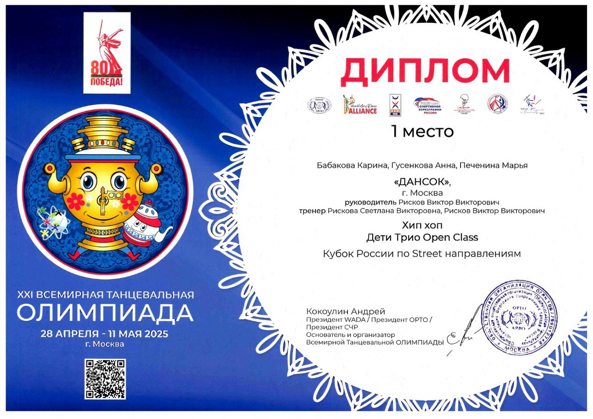Поздравляем студию хип-хоп "Дансок" и ее руководителей Виктора и Светлану Рисковых с победой на XXI ВСЕМИРНОЙ ТАНЦЕВАЛЬНОЙ ОЛИМПИАДЕ! (г.Москва) 🥇 Бабакова Карина, Гусенкова Анна и Печенина Марья заняли 1 МЕСТО в номинации "Дети Трио Open Class" (Кубок России по Street направлениям). Желаем покорения новых вершин! Молодцы!!! #кдцзаречье #культуравзаречье #культура_одинцовскийгородскойокруг #Одинцовскийокруг #ОГО #КультураОГО #конкурсы