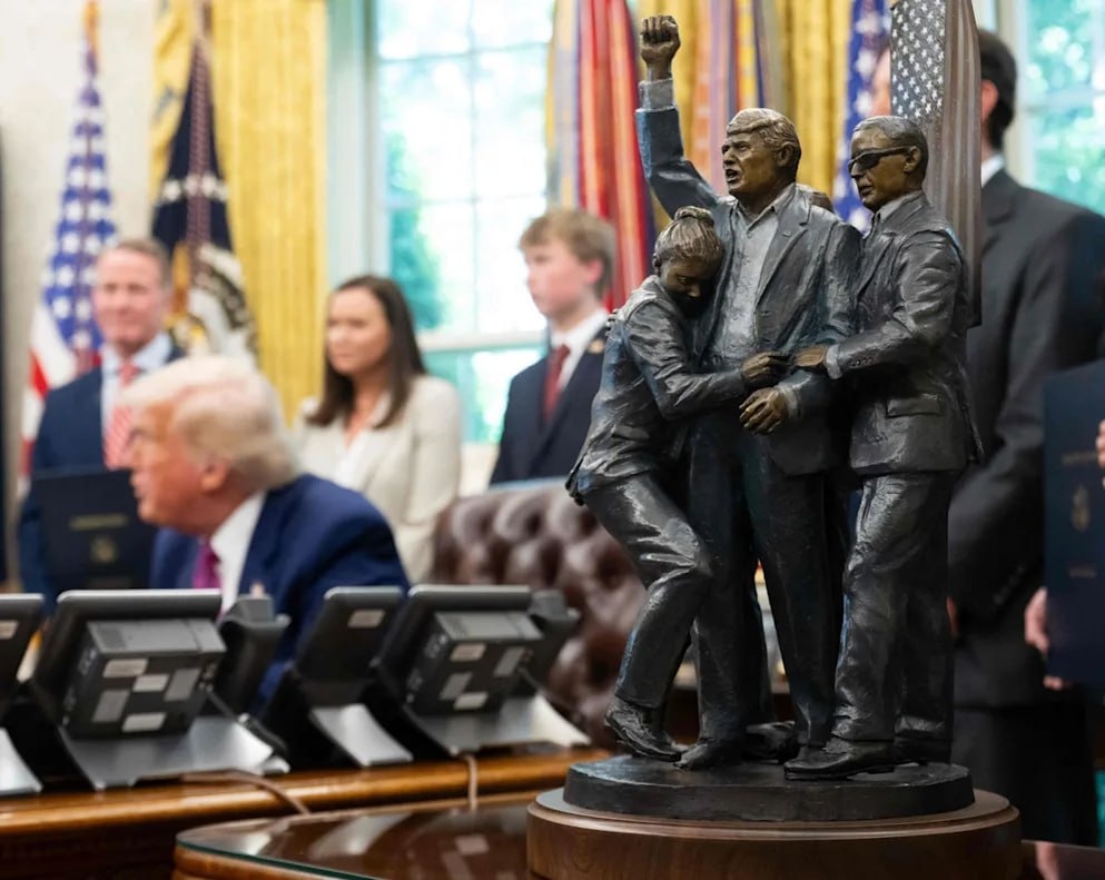 🇺🇸 Tramp ofisini unga suiqasdni aks ettiruvchi haykalcha bilan bezatdi