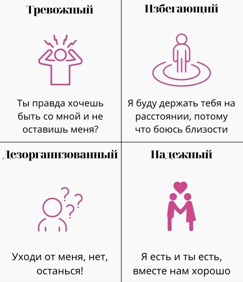 Привязанность – это глубокая и прочная эмоциональная связь, которую мы формируем с другими людьми, особенно с теми, кто заботится о нас в раннем детстве. Теория привязанности, разработанная Джоном Боулби и Мэри Мейн, объясняет, как ранний опыт взаимоотношений с родителями или опекунами влияет на нашу способность строить здоровые и удовлетворяющие отношения в будущем. Понимание типов привязанности может помочь нам разобраться в своих собственных паттернах поведения в отношениях, а также в поведении наших партнеров, друзей и близких. Существует четыре основных типа привязанности: 1. Надежный (безопасный) тип привязанности: • Характеристика: Люди с надежным типом привязанности в детстве имели последовательных, отзывчивых и любящих опекунов, которые удовлетворяли их потребности. Они чувствовали себя в безопасности и знали, что могут рассчитывать на поддержку в трудные времена. • Поведение в отношениях: • Чувствуют себя комфортно в близких отношениях. • Доверяют своим партнерам и сами