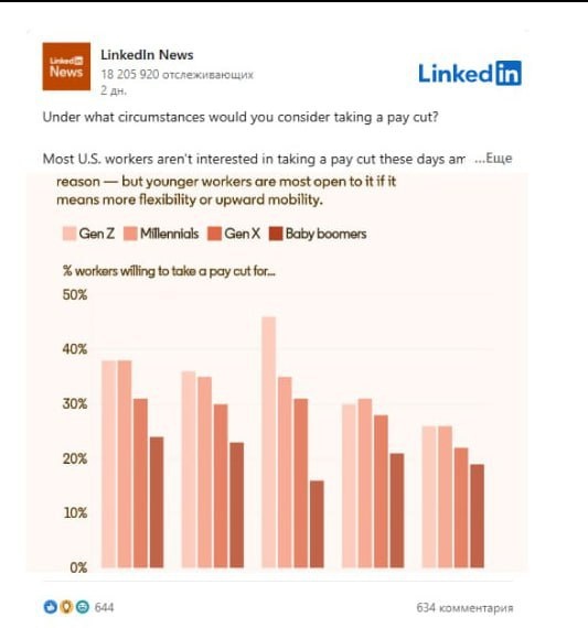 Около половины зумеров и миллениалов согласны урезать зарплату до 15% ради работы из дома, — исследование LinkedIn. Кроме того, они готовы пожертвовать частью дохода за чёткую карьерную траекторию, меньший стресс на работе и хорошие отношения с руководством.