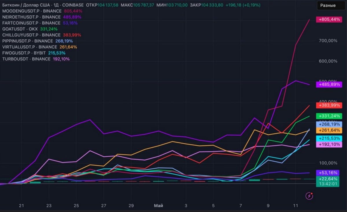 💵 Биткоин пошёл вверх, а за ним резко восстановились мемкоины, рухнувшие в апреле. На волне роста биткоина и оживления крипторынка некоторые мемкоины, потерявшие до 90% от максимумов, показали мощный отскок. Лидеры восстановления: MOODENG (свыше 800%), NEIROETH (более 400%) и CHILLGUY (около 400%). После январских пиков эти токены падали до середины апреля.