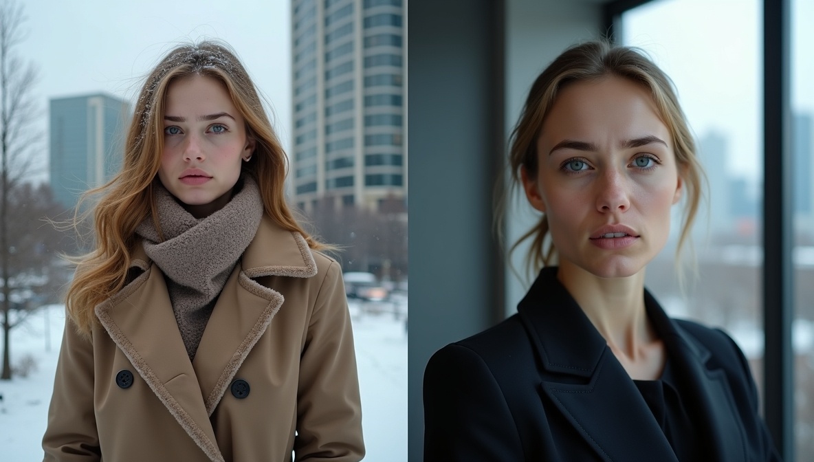 Зима. Промозглый ветер. Она, в туфлях на каблуке, поскальзывается на обледенелом асфальте у входа в бизнес-центр. Документы из папки рассыпаются по мокрому снегу.
