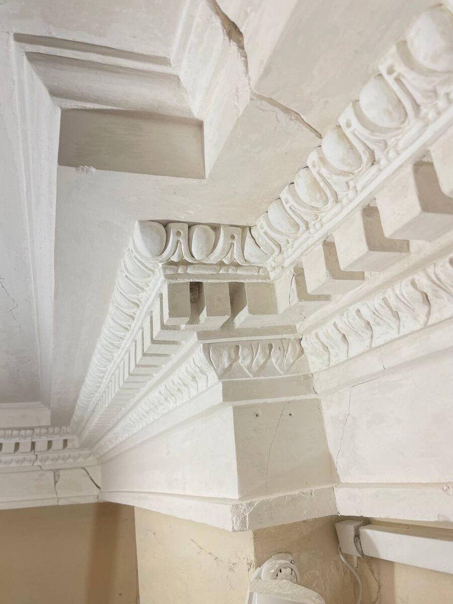 Расчищаю карниз от старой красочки, расшиваю швы и пока смотрю на утери