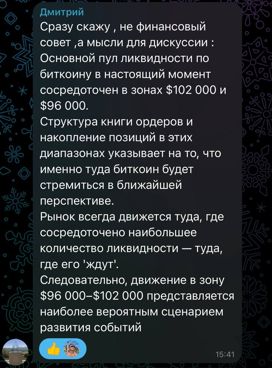 «Основной пул ликвидности по биткоину сейчас в зонах $96 000 и $102 000. Рынок всегда движется туда, где сосредоточена ликвидность — туда, где его “ждут”.»