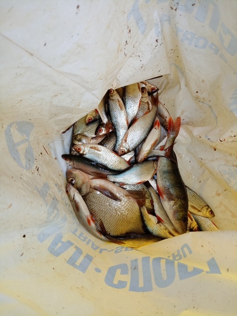 Утро встретило нас ужасным холодом. Пришлось даже пробежать пару небольших кругов вокруг поляны, чтобы хоть как-то согреться. Зато рыба отозвалась на первом же забросе. Через полчаса после подъема рыбалка стала превращаться в зимнюю: мы сидели в костюмах для неё, внутри палатки для неё же, с неба валил снег, а на крючки насаживался мотыль, но активный клёв рыбы легко компенсировал все эти погодные выверты и мы были вполне довольны.