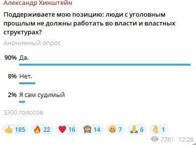 Поддерживаете ли вы, что люди с уголовным прошлым не должны работать во власти и властных структурах? С таким вопросом Хинштейн обратился к своим подписчикам в Telegram. Вариантов ответа 3, в том числе особенно забавный — «я сам судим». В первые минуты голосования подавляющее большинство курян поддержали вариант «да» (то есть поддерживают Хинштейна в том, что люди с уголовным прошлым не должны быть у власти). Парочка процентов «судимых» уже тоже проголосовали.