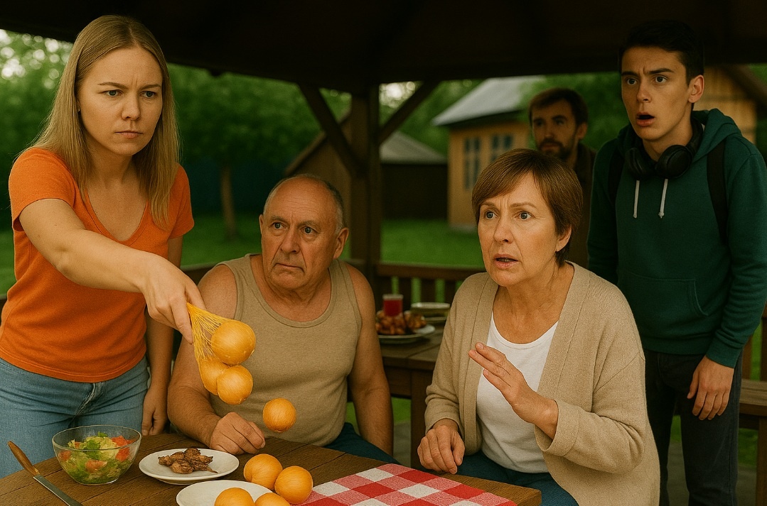 Надя вышла из дома, взяла сетку с репчатым луком, не спеша добрела до беседки и высыпала на стол килограмм нечищенного лука, прямо из сетки. Она заявила, глядя в глаза изумлённому Геннадию: