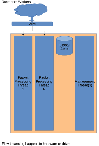 Suricata в «workers»-режиме: каждый поток (Worker) получает трафик из интерфейса, полностью декодирует его, собирает сессии (Stream) и выполняет детектирование по правилам. Архитектура позволяет задействовать несколько ядер процессора, а для балансировки потоков используются возможности драйверов (PF_RING, RSS и т.п.).